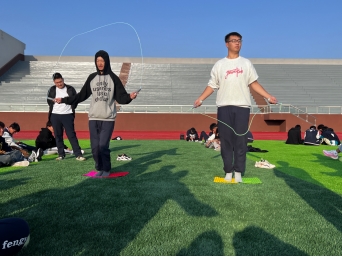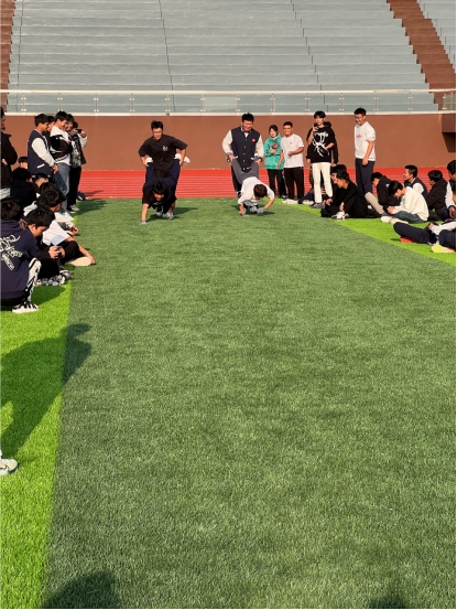 趣味运动会活动设计了多种趣味十足的比赛项目,既有考验身体协调性的“摸石头过河”,又有考验同学之间默契程度的“人力推车”,还有考验耐力的“指压板跳绳”等,学生们的欢声笑语充满了整个操场。